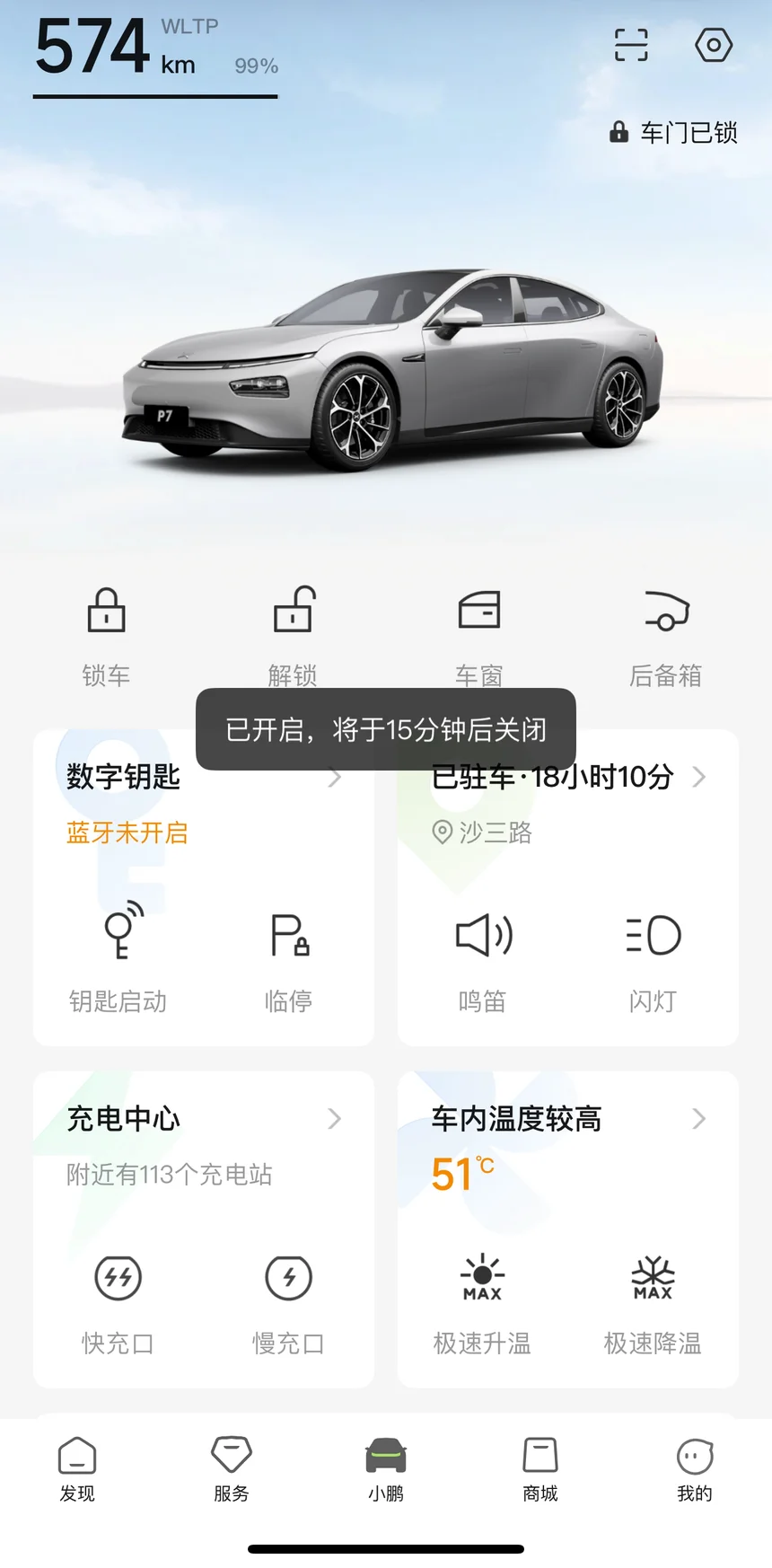 我提前一天把P7充满电,出发前下午4点半左右,气温还有30度左右,我提前把空调提前打开,把车内51度的高温降一下温。