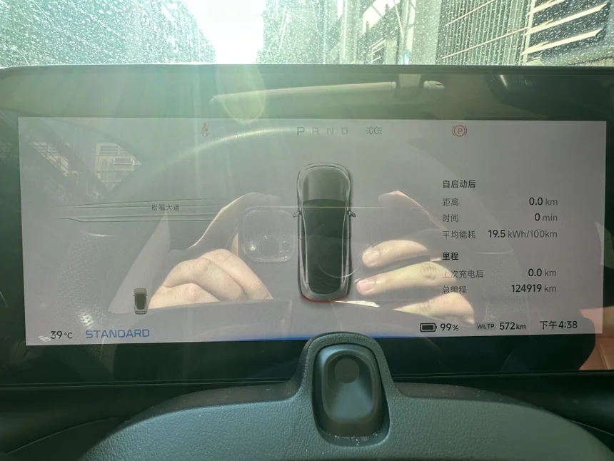 下午4点38分我上了车,开始出发,此时,P7的WLTP电量剩余572公里;室外温度29度,所以空调设置成23度四档风。驾驶模式设置成标准,能量回收设置成低。