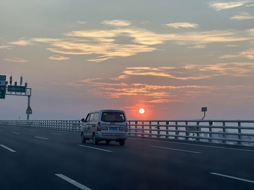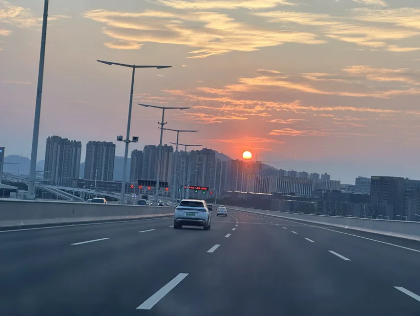 接完朋友上深中通道高速时,已经是傍晚。车在高速上平稳行驶,看到了车外的晚霞。整个天空都染成了红色,铺在高速上方,格外好看。
