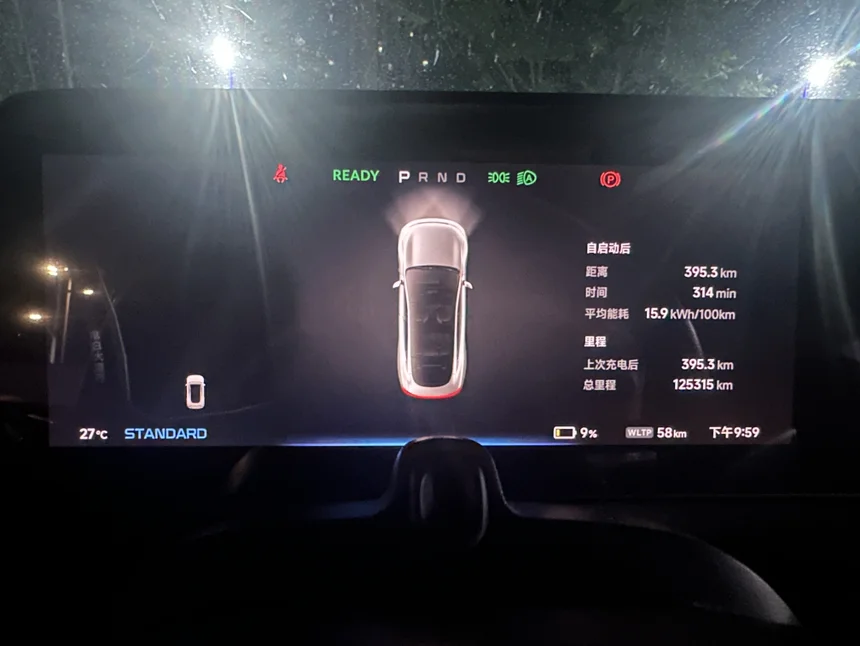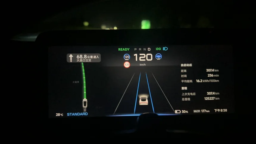 此时,晚上8点38分看了P7的仪表盘,显示走了307.4公里,WLTP续航剩下177公里,消耗WLTP续航395公里,续航达成率约78%,能耗16.2kWh/100km。