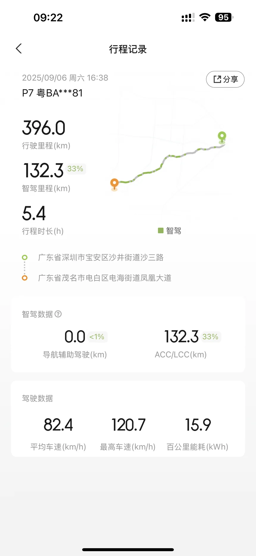 从小鹏App的行程记录来看,这段路走了396公里,行驶5.4小时,智驾占了33%,智驾行驶132.3公里,平均车速是82.4,最高车速120.7,而最终的能耗是15.9kW/h。这能耗对于载了4个人和一些行李来说,还算是能耗低的水准。