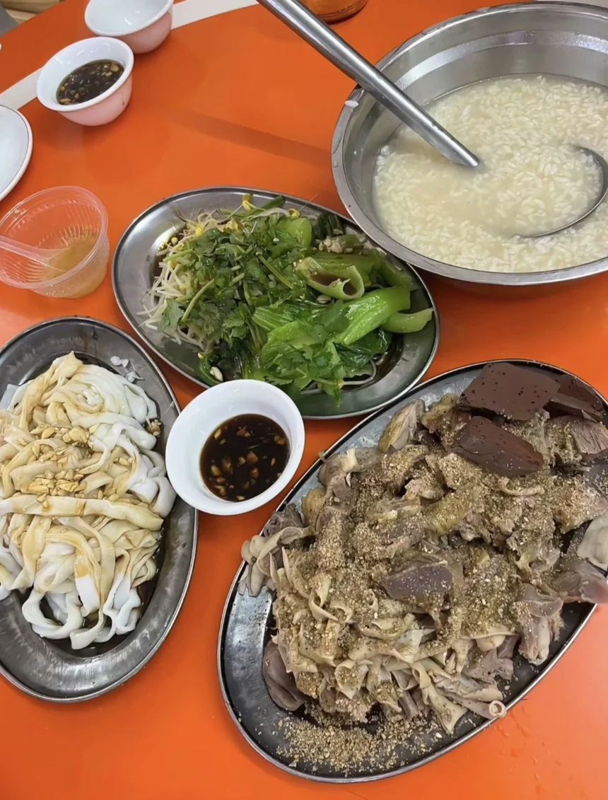 我们直奔本地餐馆尝特色菜。点了招牌鸭粥,米粒软烂,鸭肉鲜嫩,喝起来很暖胃。白切鸭皮滑肉嫩,搭配的蘸料是灵魂,一口下去很提味。
