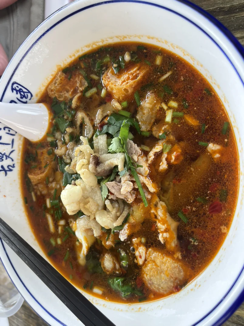 乘小鹏盘山而上,爱晚亭的红叶未满,但林间清风已值回车票价,午后一份湖南特色烧汤粉补充能量。