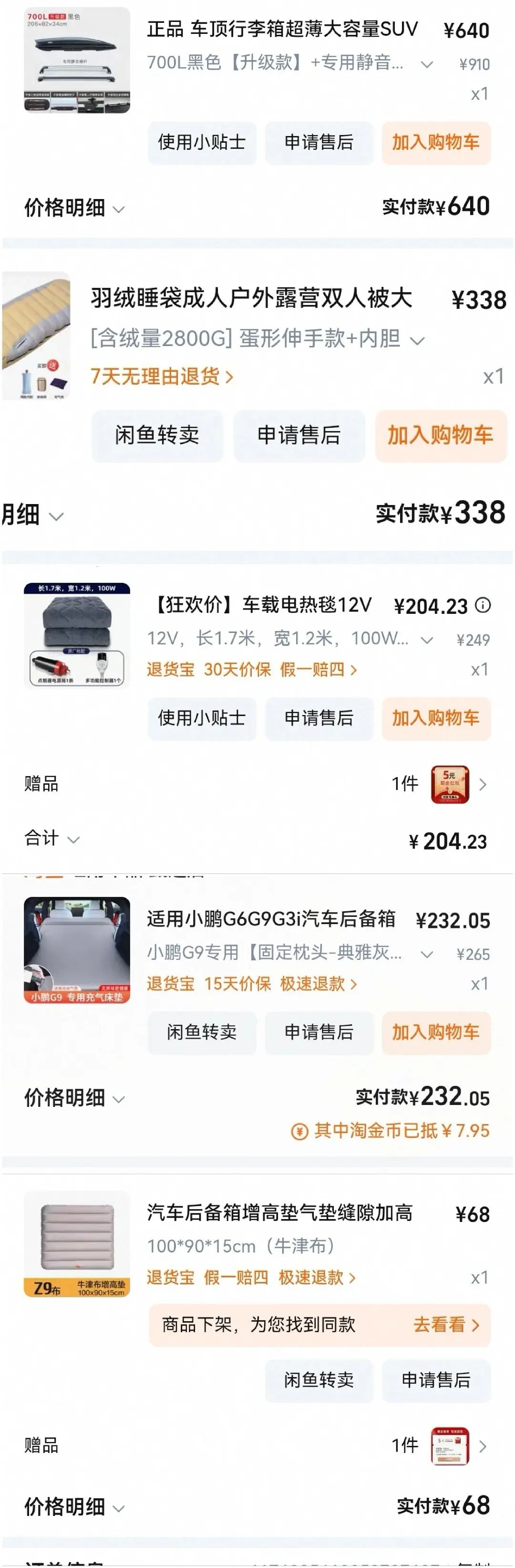 刚提车是奔着床车及用电方便还有智驾体验去的,智驾及整车智能化在我个人看来是大分项 。在此前提下,结合 G9 的一些优缺点以及买完车后抠抠搜搜的预算,首先就是根据床车露营需求解决尾箱补平,方案是充气补平垫 90*100*15+水晶板 50*90+床垫 (110-135 大小头)*180+床品。另外加装了一个 700L 车顶行李箱解决装载问题。
