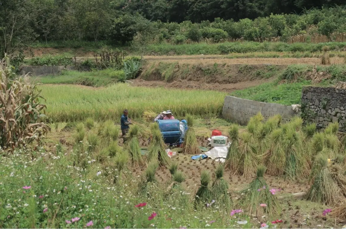 田埂间,农人的身影与现代化农机相映成趣,古老地貌与农耕文明在此共生。