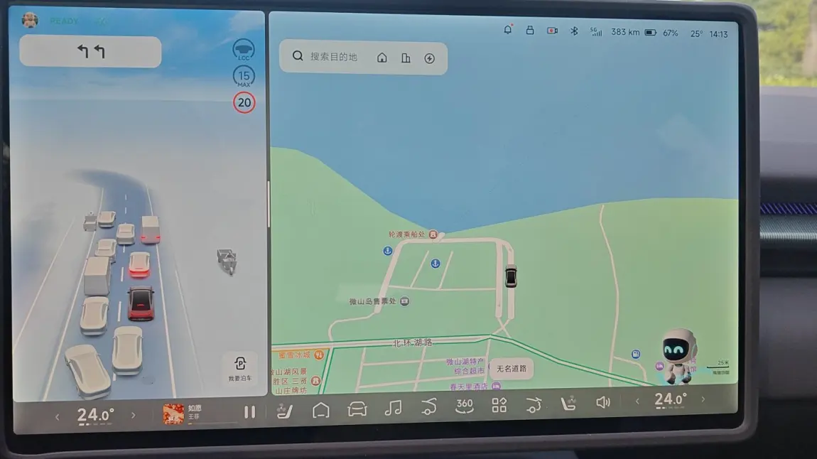 我的新P7也算是坐过船了。轮渡一次能拉40辆汽车,从码头到岛上20来分钟,渡轮还有个二层,供游客远眺岛上风景,拍照打卡。因为是秋天,气温舒服适合出游,但满湖的荷花早已凋谢,荷叶也已泛黄,太不美就没拍照。