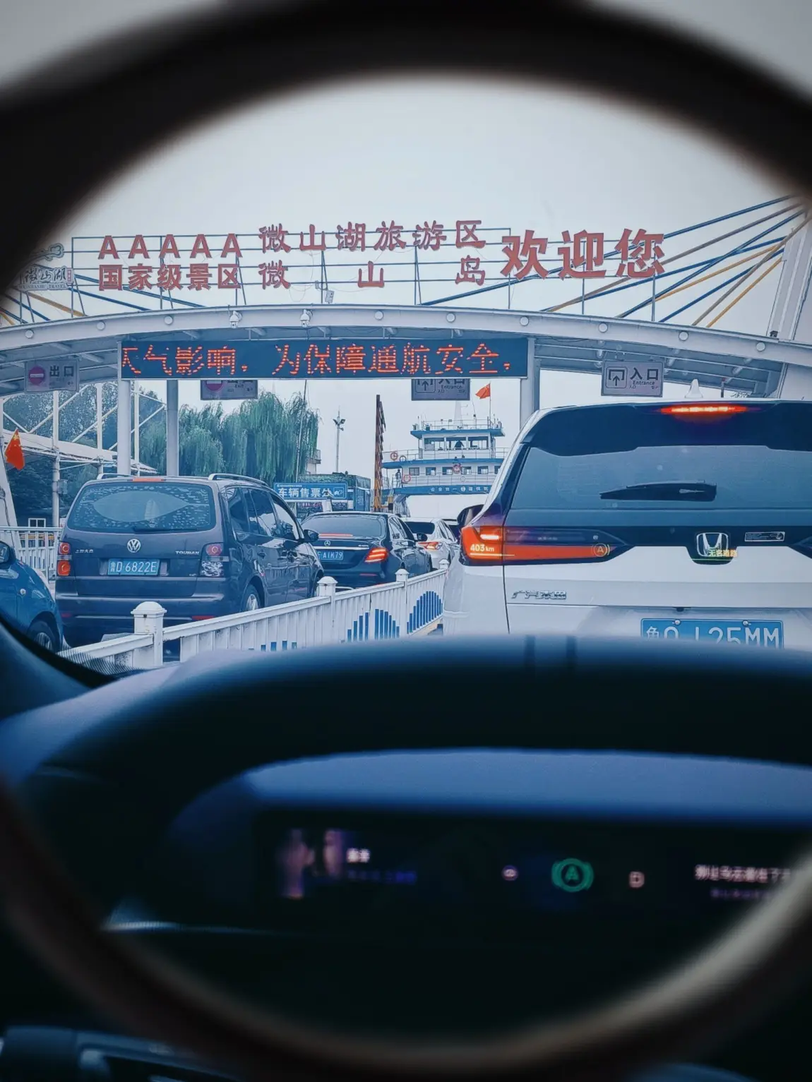 微山湖旅游区距离高速口就一个红绿灯,下了高速很方便。景区人很少,我们在咨询了工作人员后决定开车上岛。