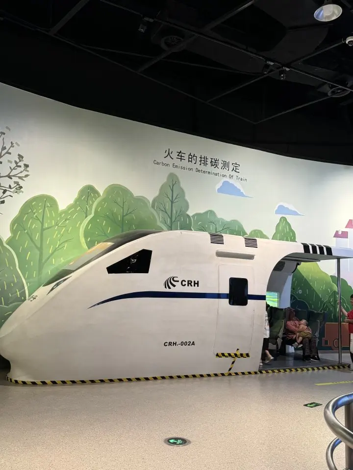 刚进馆就被一楼的「低碳出行区」戳中!有新能源车模拟驾驶台,娃一坐上去就拽着方向盘不肯动——开的时候实时跳“减少碳排放XX克”,我家娃边喊“我要开绿车!”边问“妈妈,我们家的车也能这样吗?”,比我讲10遍“新能源车环保”管用多了!