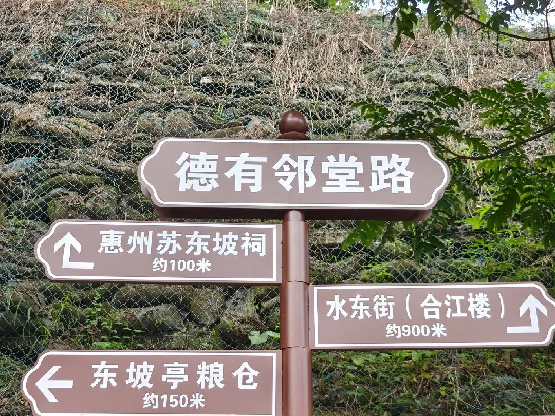 白鹤峰位于桥东。绍圣三年,苏东坡在此筑屋二十间,绍圣四年新居落成后迁入。这是苏东坡生平唯一一处自己出资购地并设计营建的居所,他在此筑屋20间,将客厅命名为“德有邻堂”,书房命名为“思无邪斋”,还雇人凿井解决用水问题。