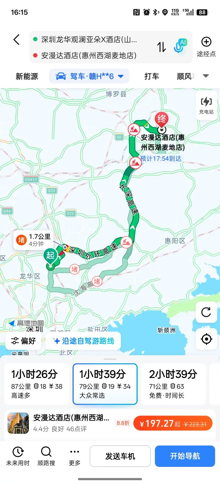 10月4日一早,便趁着早上8点前的谷电时间,在酒店周边的充电站补电至87%。之后返回酒店用餐后,便启程惠州。中午前,抵达惠州酒店,抵达时,G6再一次发挥了出奇的能耗表现,全程70km,且高速占比超70%,能耗仅为13.9kwh/100km。@鹏友俱乐部 @充电小助手