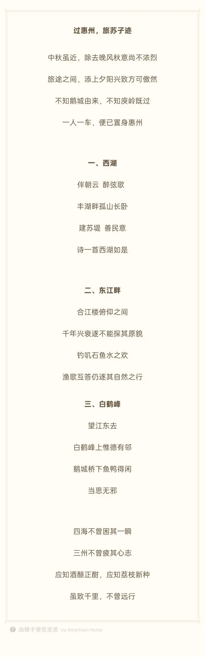 国庆节前,重温了林语堂先生的《苏东坡传》,便有了探寻东坡“三州”的计划。正巧,因为赣州朋友的婚宴和大学室友的邀约,便一人一车开启了南下的旅途。而作为距离深圳只有1小时车程的惠州便顺理成章的成为了我探寻东坡“三州”计划的第一站。