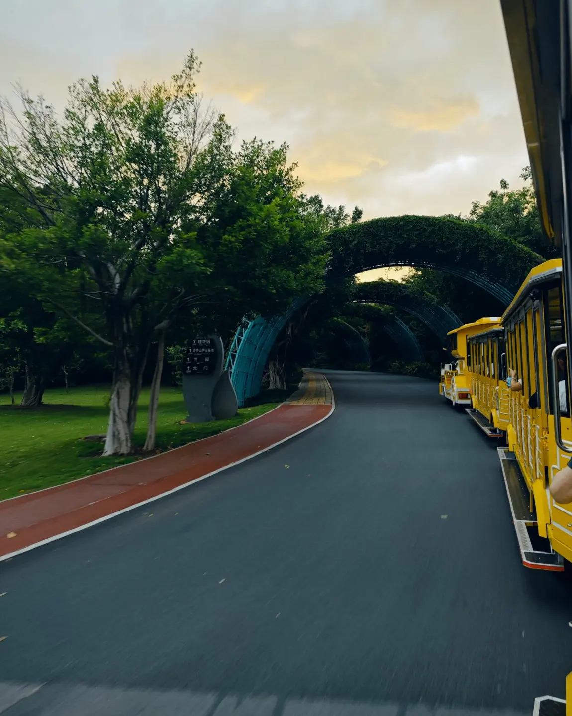 暮色渐浓时,我坐在湖畔看夕阳为水面镀金。三两只白鹭掠过水面,激起圈圈涟漪。小朋友则独爱这个小火车,临近傍晚,一路坐到北门,夕阳也是真的美,到北门后又参观了夜花园。