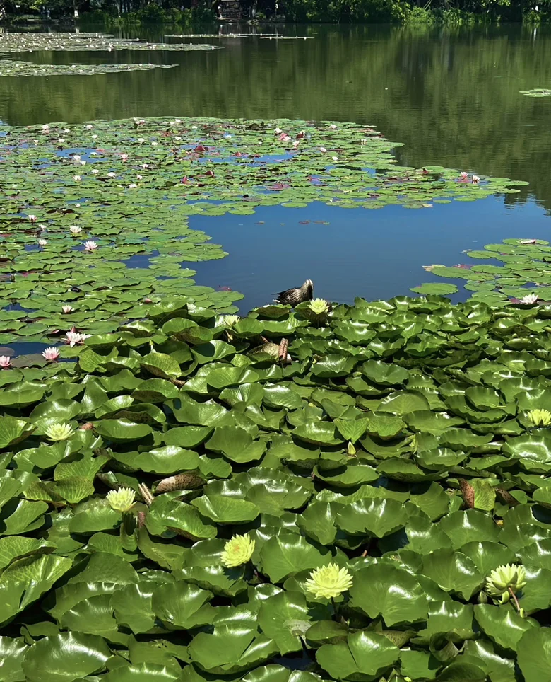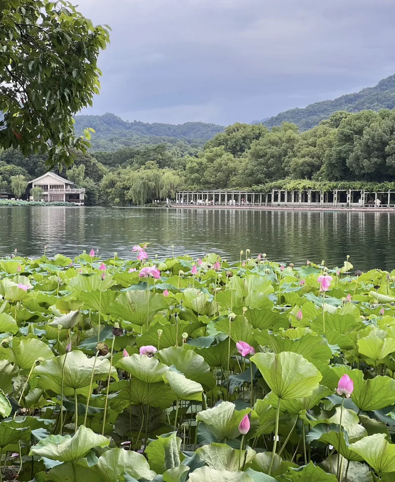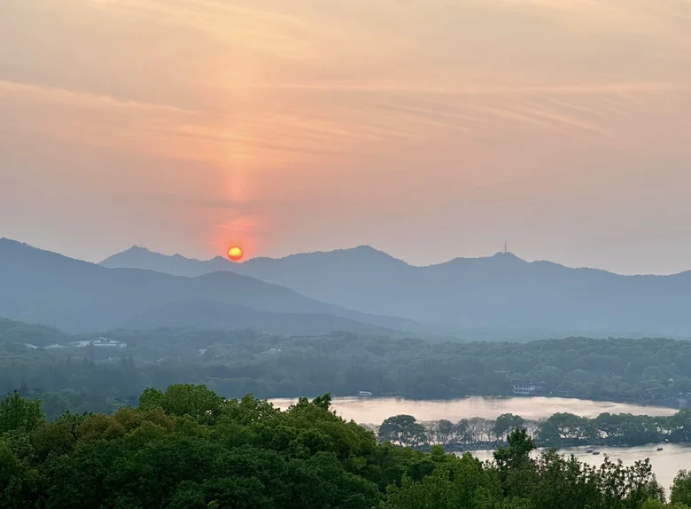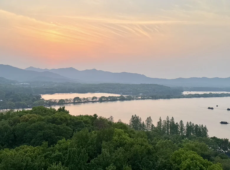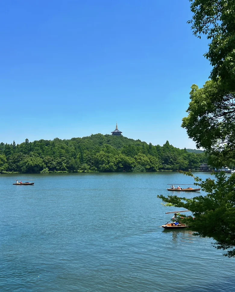 随后沿着西湖边漫步,从雷峰塔一路走到苏堤。湖面微风拂面,柳枝轻摇,远处是断桥残雪的轮廓,近处是花港观鱼的游鱼与荷花。我乘坐西湖游船,缓缓划入湖心,船娘轻声讲述着三潭印月的由来。夕阳洒在湖面上,金光粼粼,整个西湖仿佛镀上一层温柔的滤镜。此刻,我感受到一种久违的平静与满足,仿佛整日的奔波与喧嚣都被这片湖水洗净。