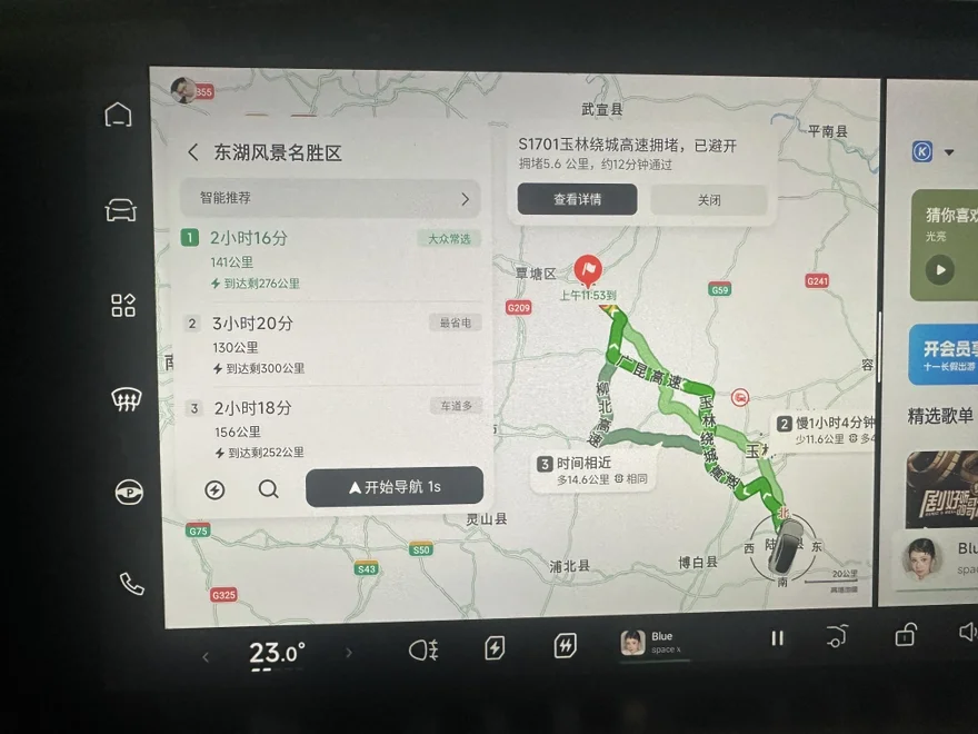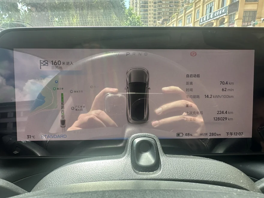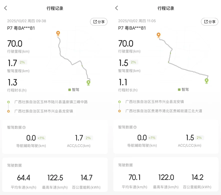 又走了一小时,跑了70.4公里,到贵港的景区了。一段消耗P7的WLTP续航80公里,续航达成率依然是88%,能耗在14.2kWh/100km。和第一段路差不多。