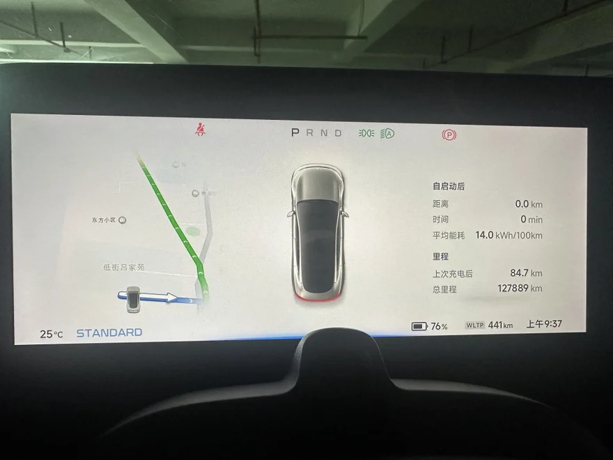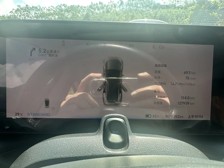 早上9点37分出发,我的P7电量WLTP剩余441公里,驾驶模式设置成标准模式,能量回收设置成低。空调23度4档风。车上父母家人正好满载5人。