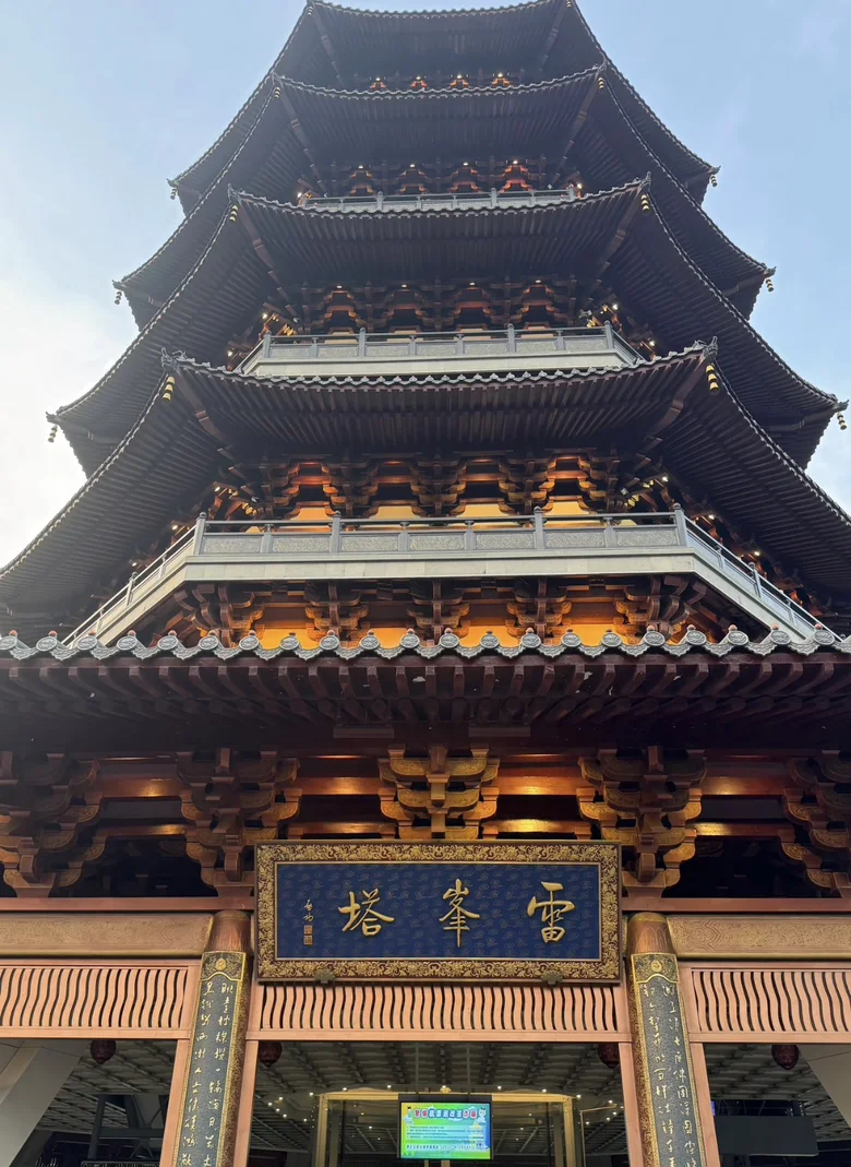 离开灵隐寺,我乘坐1314路公交车前往西湖边的雷峰塔。这段路程约8公里,沿途穿越西湖西侧的山林与茶园,车窗外的风景如同一幅流动的山水画。雷峰塔矗立在南山路尽头,夕阳下的塔影倒映在湖面上,正是“雷峰夕照”的意境。我登上塔顶,俯瞰整个西湖,湖面如镜,苏堤、白堤、三潭印月尽收眼底。塔内设有电梯,方便游客逐层参观,每一层都展示了雷峰塔的历史与白蛇传的传说,让人仿佛走进一段古老的神话。