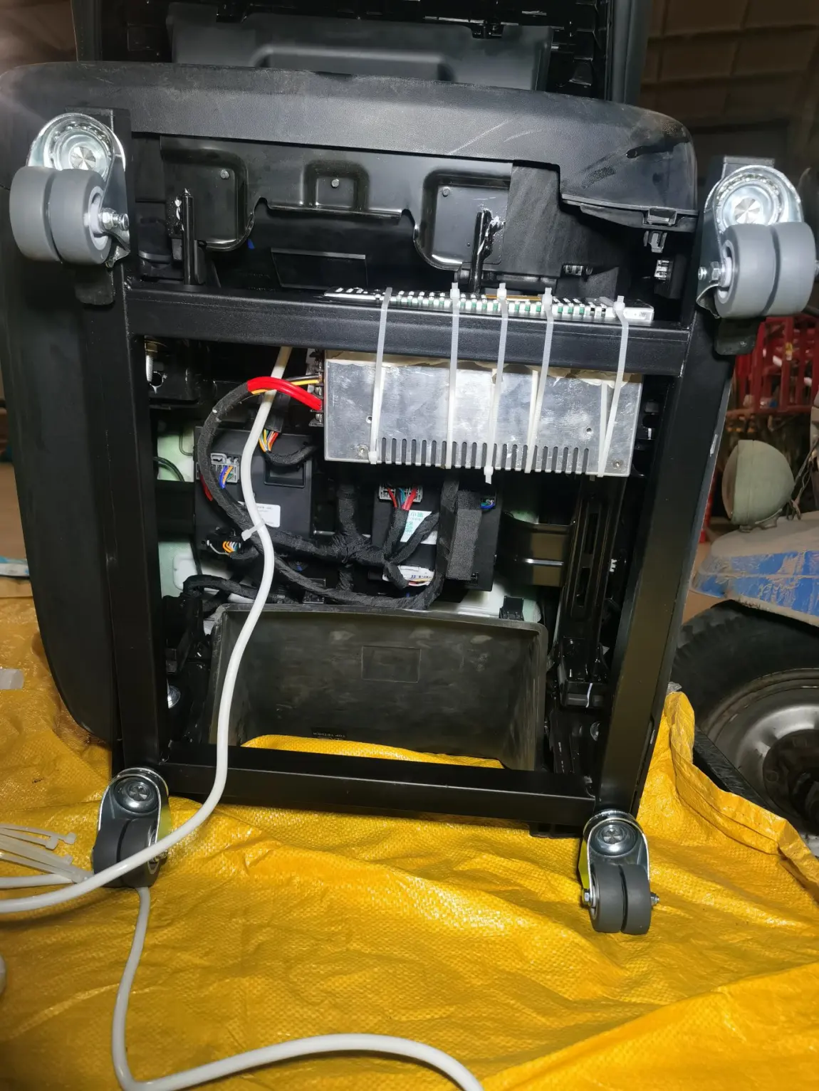 靠背上的插头,还有坐垫下边的插头都需要连接,连接好之后通上电就能用了,商家,第一代产品,如果说动手能力不强的小伙伴肯定是自己安不成的,随后商家又出了第二代产品,两款产品间隔时间不长,我又把第2套产品买了回来,装起来非常的方便,就把两个插座一对接,把支架固定上去就OK了下来,装装螺丝也就一个多小时