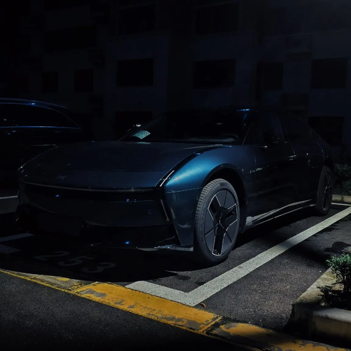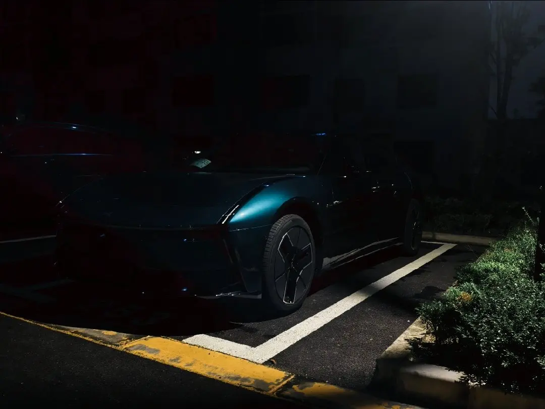 晚上路灯的灯光打在前翼子板上,整个曲面的形态若隐若现