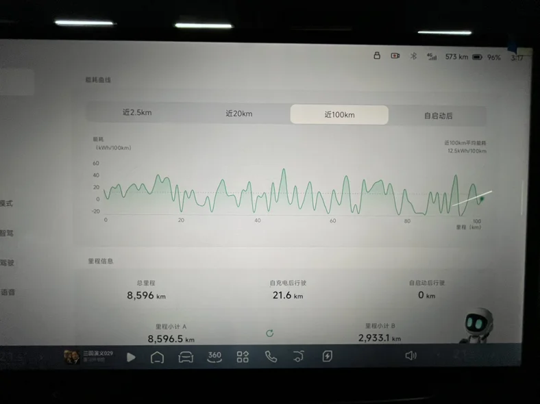 首先续航,城市道路跑500公里,电量剩余10%左右,我也跑过几次长途,时速保持在110-120km/h,电耗会上升到16-17kWh/100km,纯高速公路情况下,满电续航也能保证在400公里以上。