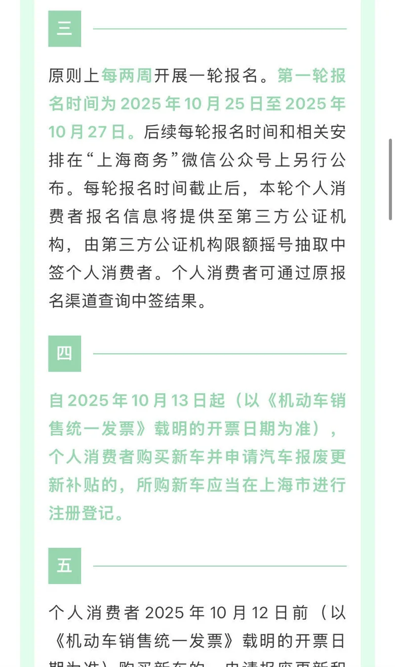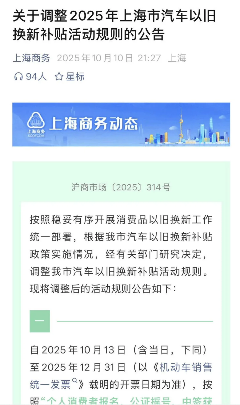 上海的置换补贴情况:从10月13日至12月31日之间开票的新车,需通过“报名—公证摇号—中签”流程获取补贴资格。