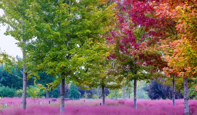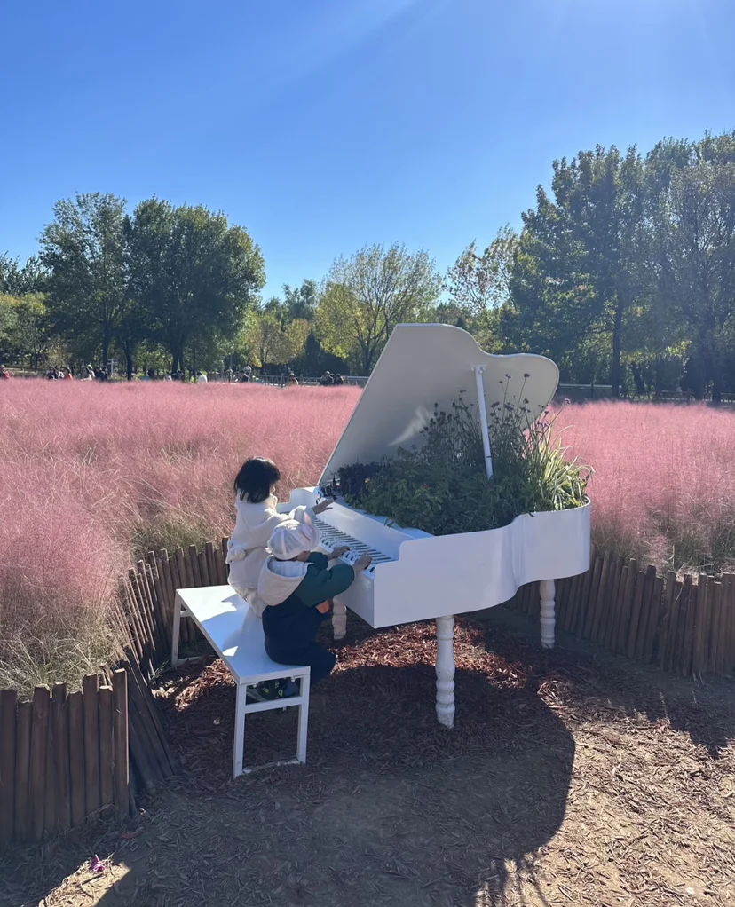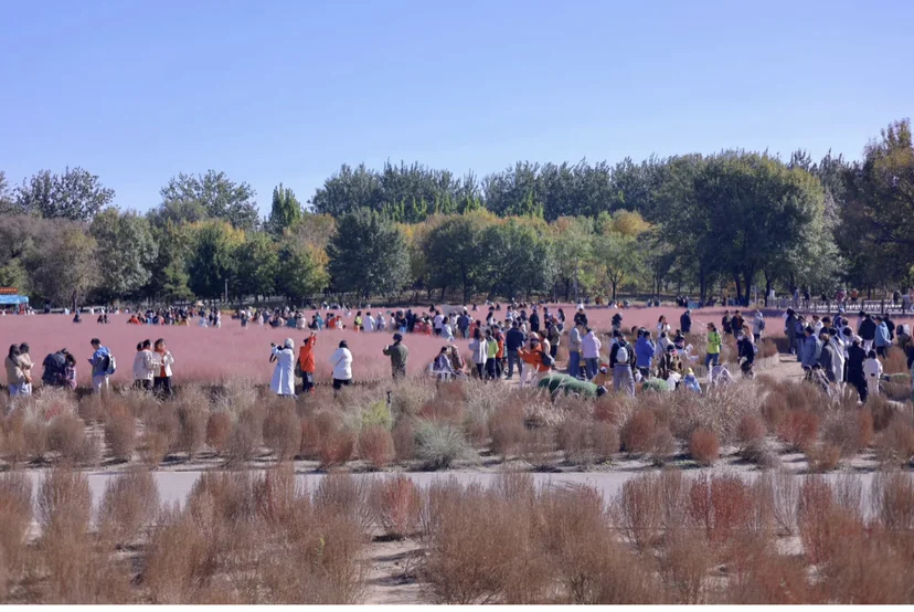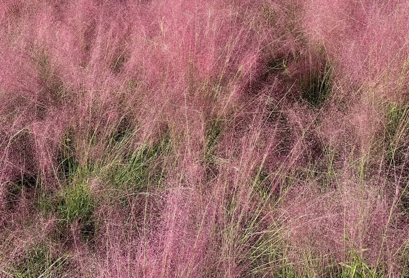 (三)最难忘的是那片粉黛子草。从西门向里走,大片暖粉色映入眼帘,齐腰高的花穗密不透风,灰蒙蒙的粉不扎眼,反倒像地上铺了层柔软的棉花糖。我和其他游客沿着步道穿行,半截身子被粉穗环绕,拍照的笑声与草木的清香交融。