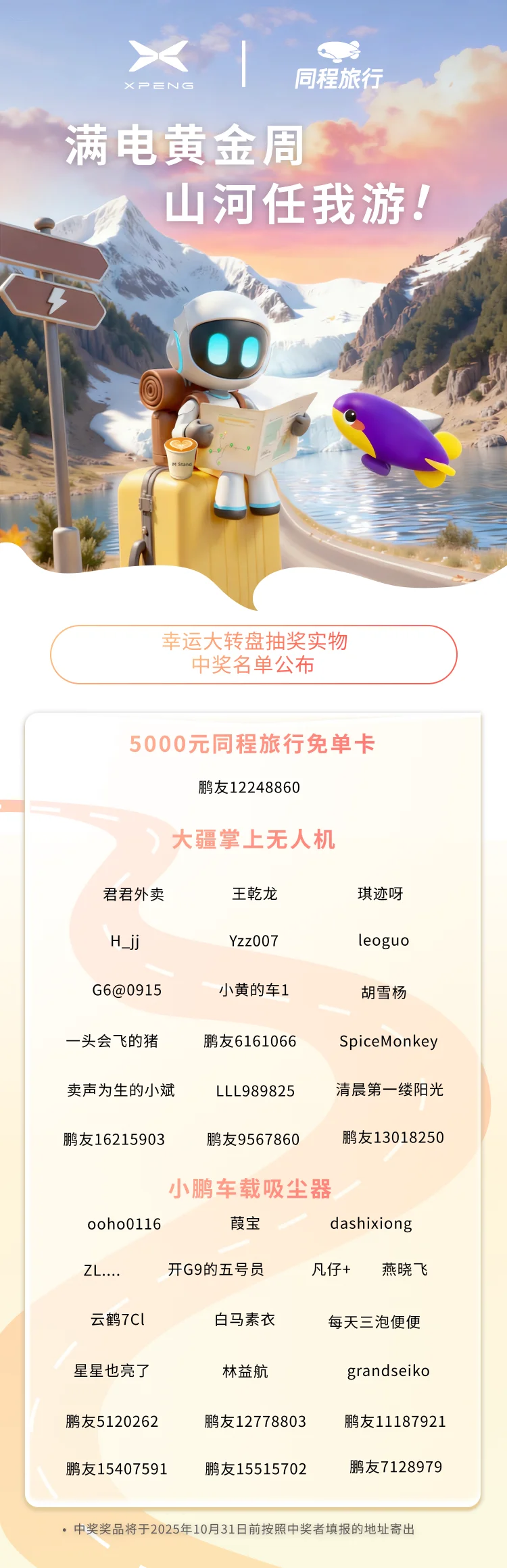 请还未填写收件地址的鹏友尽快通过【抽奖活动页—中奖记录】或【消息中心—充电—点击中奖提示】进入地址填写页面,奖品将在10月31日前完成发货。