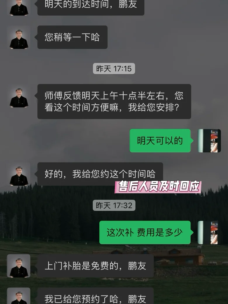 小鹏G6的售后服务确实值得称赞!第一次遇到车胎被扎,下班后有些不知所措,立即联系了售后工作人员。到店先补了气,因时间已晚,补胎安排在第二天。售后响应非常及时,不仅主动来电确认时间地点,还提供免费上门补胎服务,省去我跑一趟去线下维修。整个补胎流程高效专业,从检查、拆卸、补胎到安装复位,全程仅用半小时,还贴心为其他轮胎检查胎压井补气。为小鹏的优质服务和小哥的专业态度点赞!👍👍👍#杭州移动上门服务 ##小鹏暖心服务#