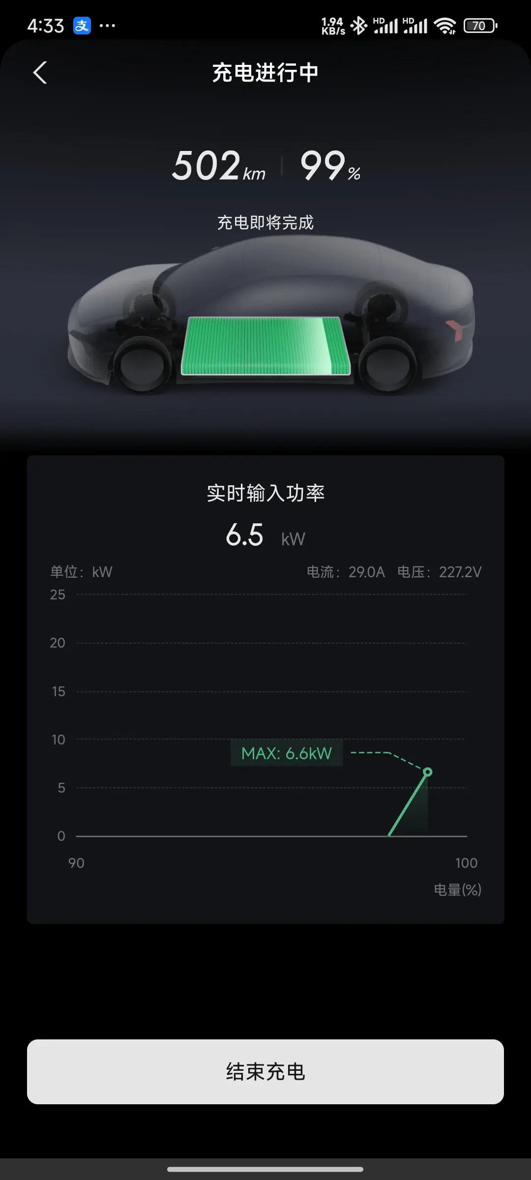 续航方面相当扎实,市区日常通勤开空调、用座椅通风,实际续航约480公里,达成率超80%,平均电耗12.6kWh/100km ,一周充一次电完全够用,毫无续航焦虑。周末自驾往返200公里,去程用小鹏S4超充补能,30分钟从30%充至80%,补能效率很高 。