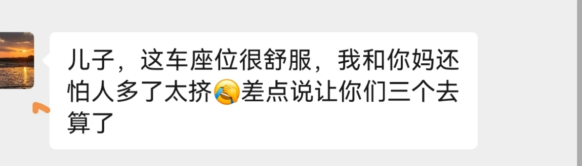 电耗惊喜十足,深圳城区通勤 + 周末短途东莞广州佛山出游的综合电耗稳定在 15百公里左右,即便开空调提前预冷,能耗也没明显飙升。上周全家往返佛山200多公里,到家还剩 50多电量,完全告别续航焦虑。大五座布局太适合五口之家,2890 毫米轴距带来宽敞后排,老人小孩久坐不挤。后备厢轻松塞进自行车和三个行李箱。座椅舒适性是点睛之笔,真皮座椅的通风功能和短短几秒速凉,搭配座椅按摩,无论是市区堵车还是高速巡航,家人都没喊过累。