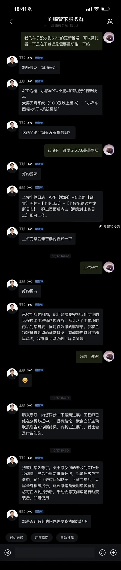 提车了几天一直没有收到最新的5.7.8更新推送,果断联系了管家检查。管家的处理非常的专业迅速,工程师查看了车辆日志后重新推送了一下,下班的时候车机就已经有更新的提醒了。半天不到的时间就切切实实帮助解决了问题,响应速度太牛了。