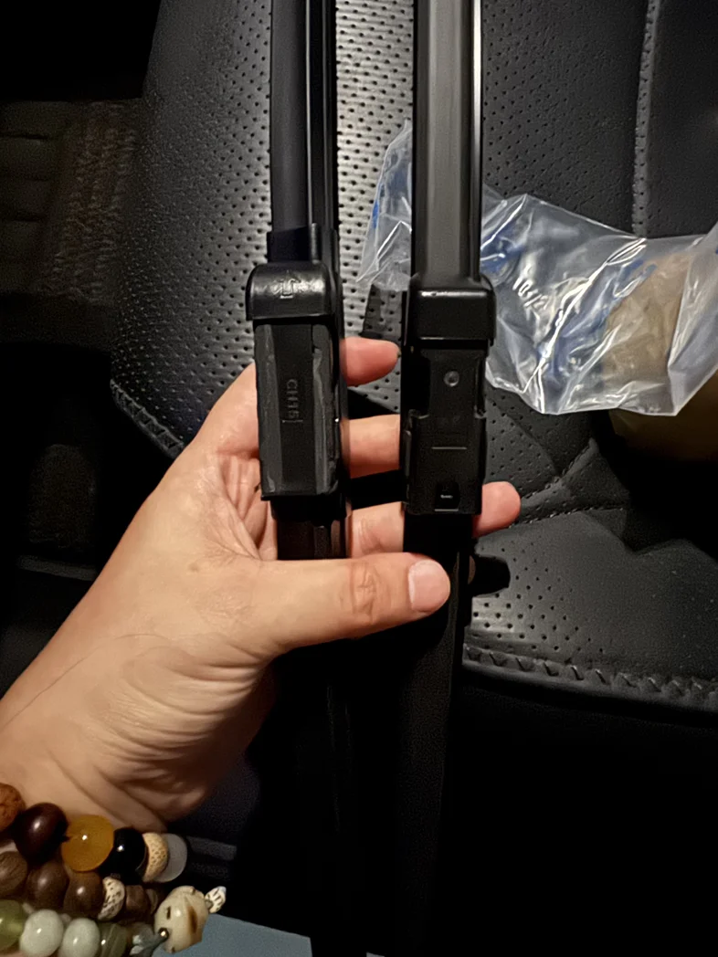 从提车到参加完五一去油膜活动后就开始出现雨刮异响。刚开始是雨刮刮不干净,总是有一条一条白色印子+水印,后面找出原因是去油膜的时候,售后没帮我洗雨刮胶条,结果我还一直使用,雨刮胶条直接坏了。正好商城有雨刮器更换的券,买了之后去售后换了没一个月,出现撞A柱cengceng的响,还特意去ssss店也没查出原因,说要不再换个雨刮器试试,又下了一单。这一单刚开始还行,不到两周又有声响了!!!我就放弃原厂,在小红书这里找到一家良心店铺,东西到手之后和原厂对比(左是卖家的又是原厂的),真的天壤之别!!超级静音!!!卡扣还有绒布加强固定!!售后老板也超级nice!!推荐给了几个鹏友都说不错👍👍