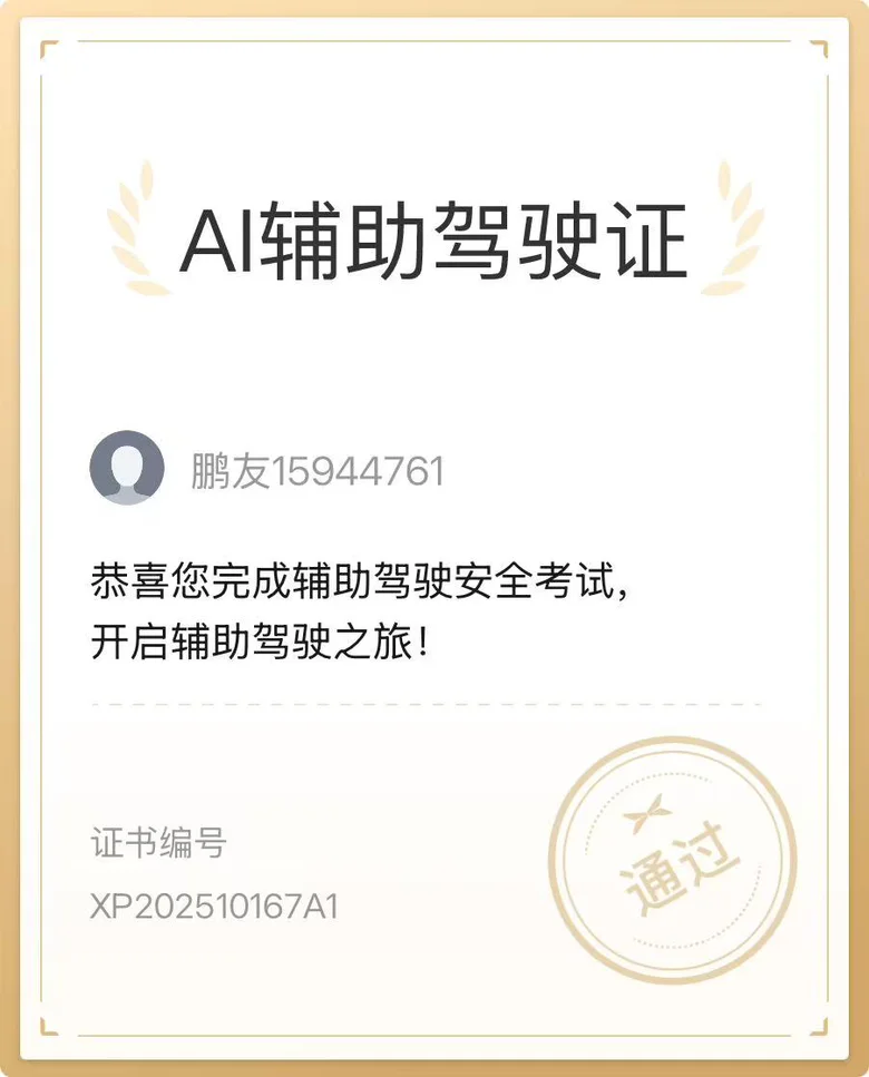 ps: 比较中意小鹏的智驾,车未到提前考了小鹏的‘AI辅助驾驶证’,等车到后,开启了愉快的智驾旅程。