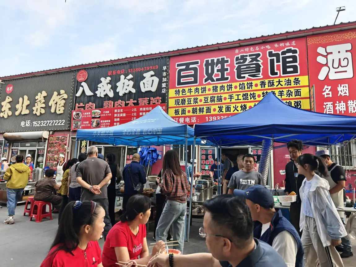清晨从驻车地出发,直奔当地早市。还没走近,就被“八戒板面”“百姓餐馆”的热闹吆喝声吸引。东北菜馆的烟火气、板面店的浓郁香气交织在一起,构成了最鲜活的唐山清晨。