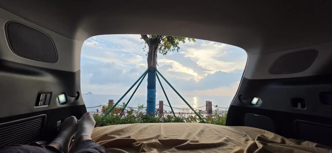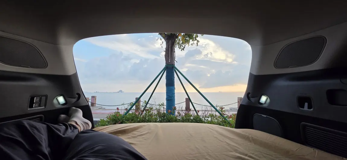 - 作为不习惯早起的人,在车内观赏日出尤为惬意:设定闹钟后,开启后备箱即可欣赏海景日出,结束后可继续休息