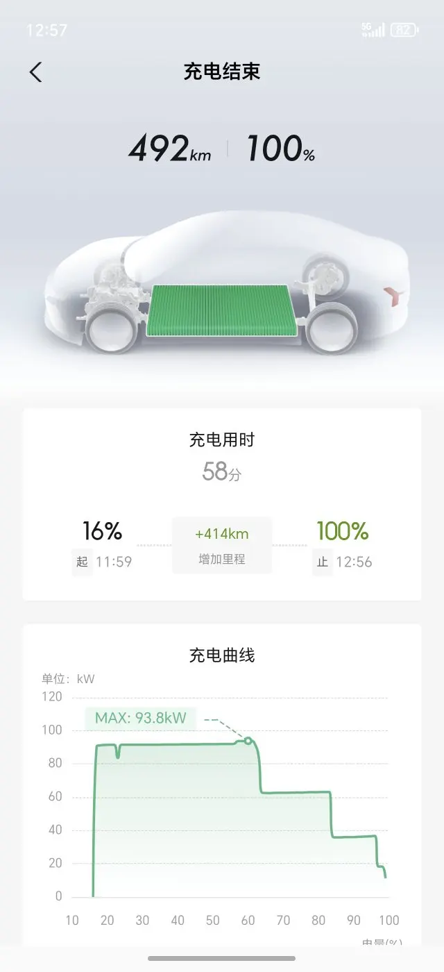 2、续航和补能表现比较满意:在一次快充中,从16%到100%用时58分钟,峰值功率达到93.8kW,增加了414公里的WLTP续航。日常通勤的能耗也相当经济,平均电耗稳定在12kWh/100km左右。