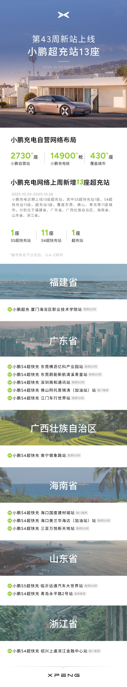 2730+站 | 2025年第43周上线小鹏超充站13座