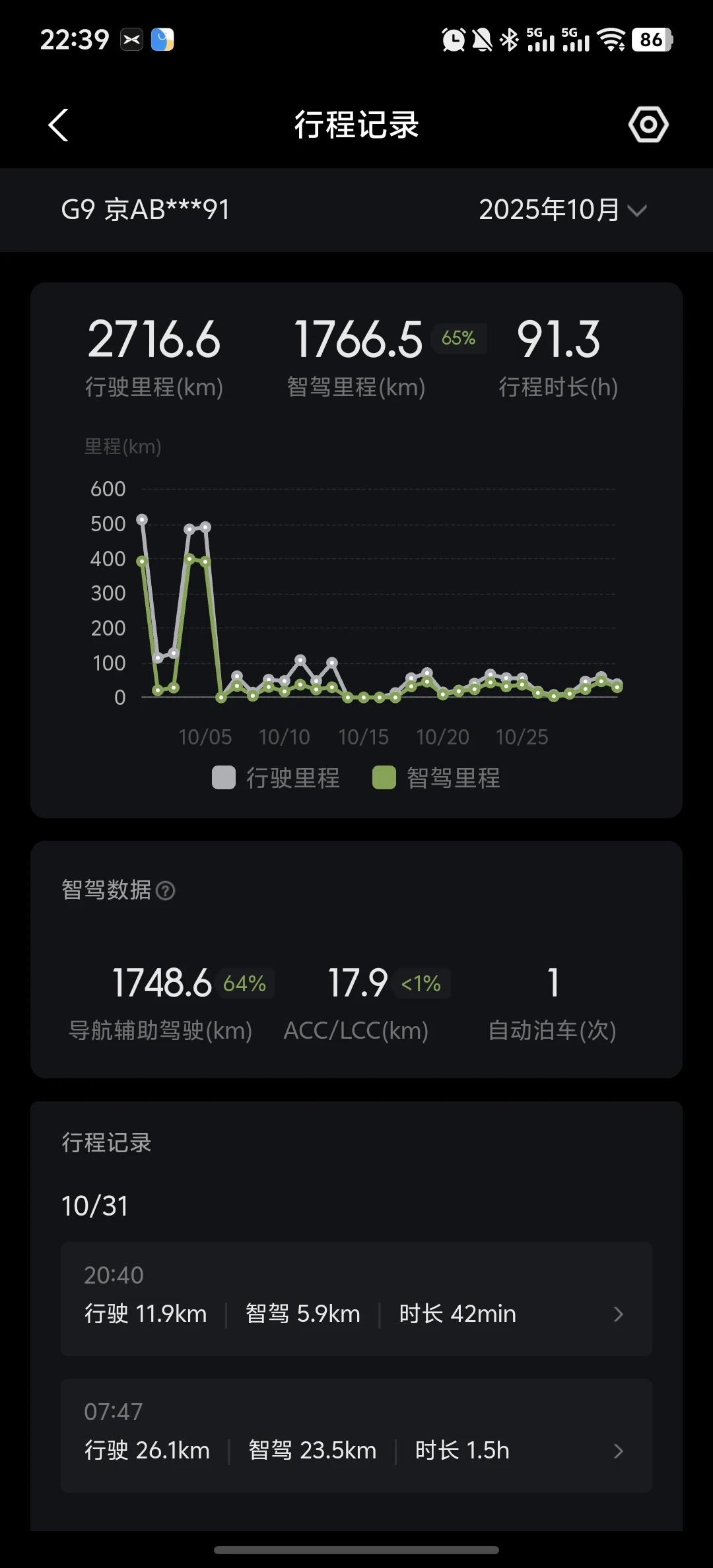 金秋十月是我最爱的季节,是非常适宜出游的时期,没有半点儿犹豫,我们全家驾驶着小鹏G9行走了2700多公里,安全舒适前往了从未踏足的辽宁大连,去了海滨小城兴城,往返天津等,在北京的大街小巷感受金色的美好。不知不觉半年跑了17000公里,智驾行驶了9200多公里,踏足了19个城市,陪伴我225天。