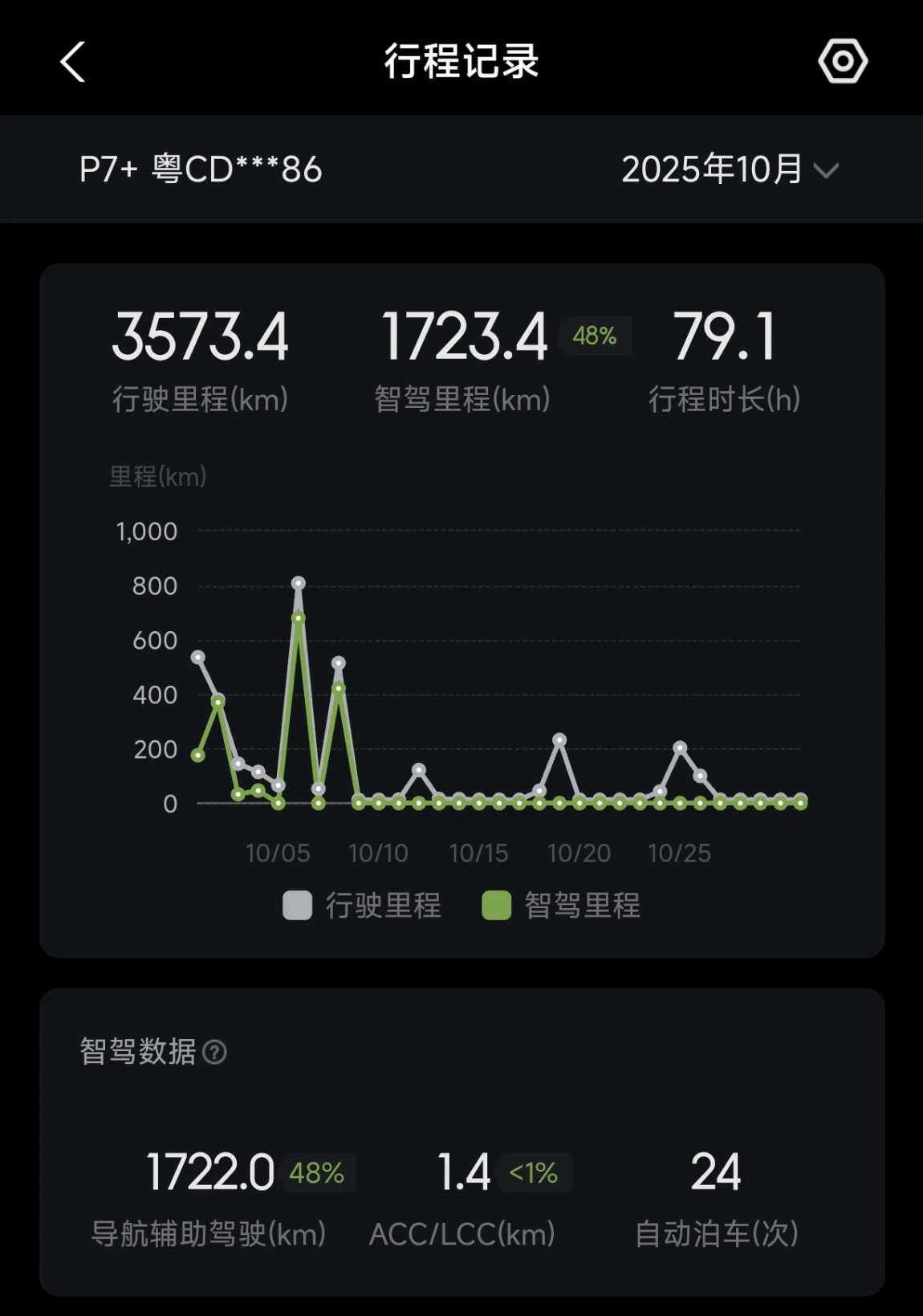 在过去的10月份里,我与我的小P7+共同行驶了3573.4公里,其中智能驾驶模式下跑了1723.4公里。