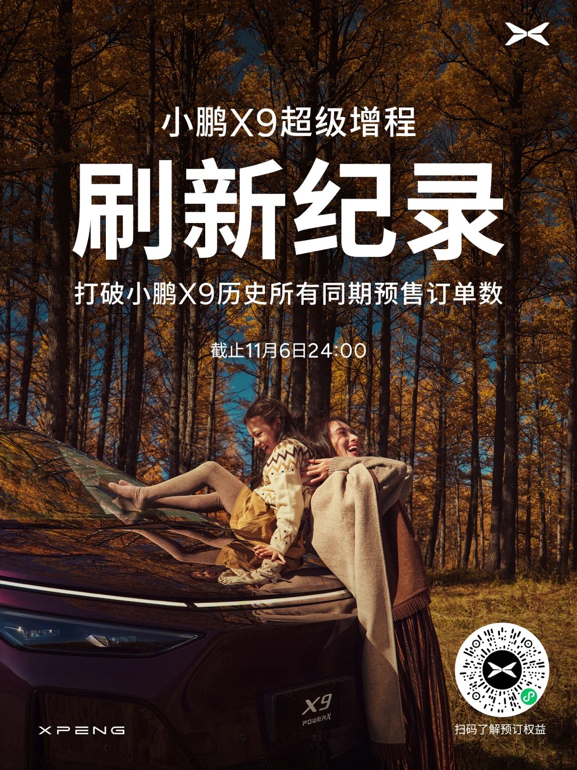 小鹏X9超级增程预售订单刷新X9历史同期纪录。
