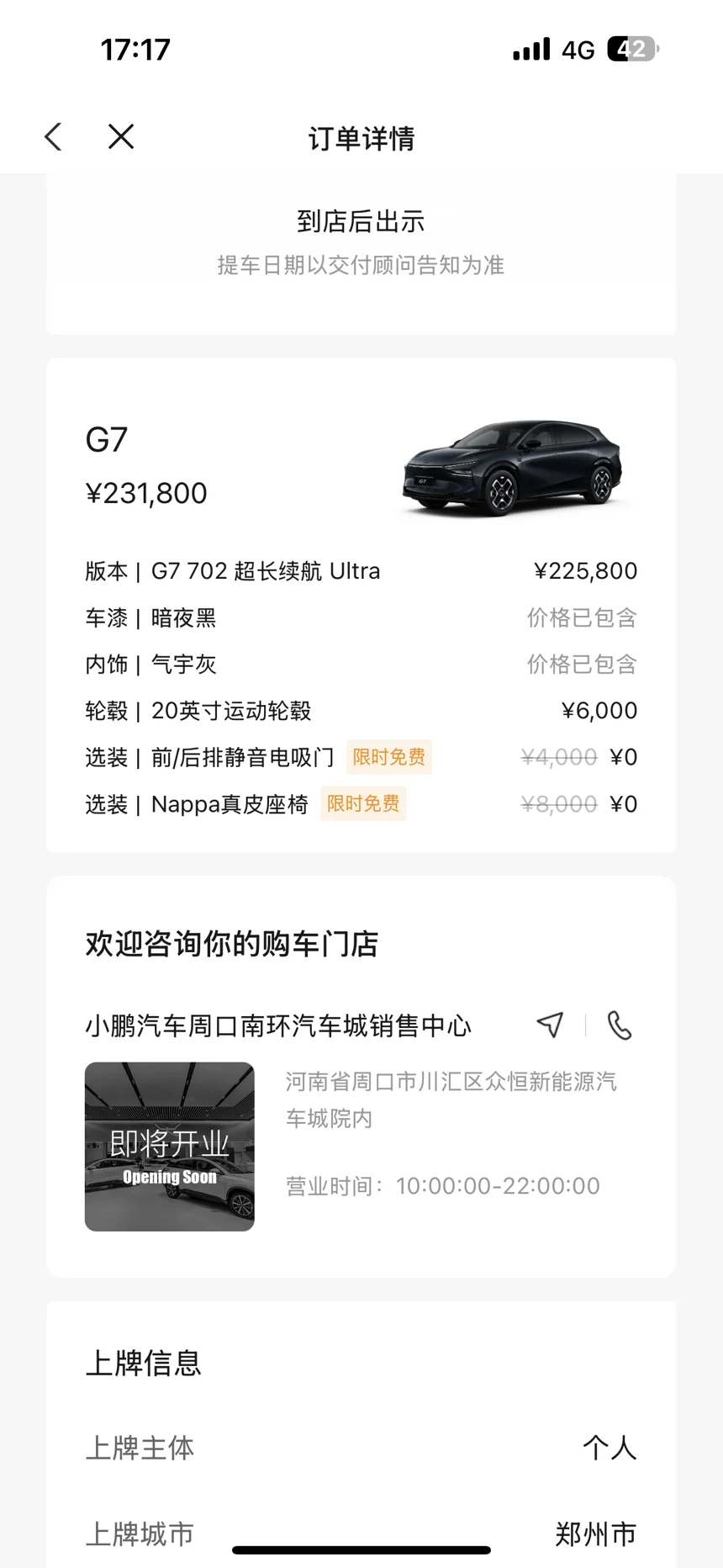 10月2日,想起家附近新开了小鹏门店,就去看了看。销售先了解需求后推荐了G6,但我们随口问了下停在旁边的G7,看到内饰和配置比G6好太多,就先预约了G7的试驾。虽然销售刚入职对车辆细节不够了解,但他会去查和咨询老销售和店长,态度非常真诚。