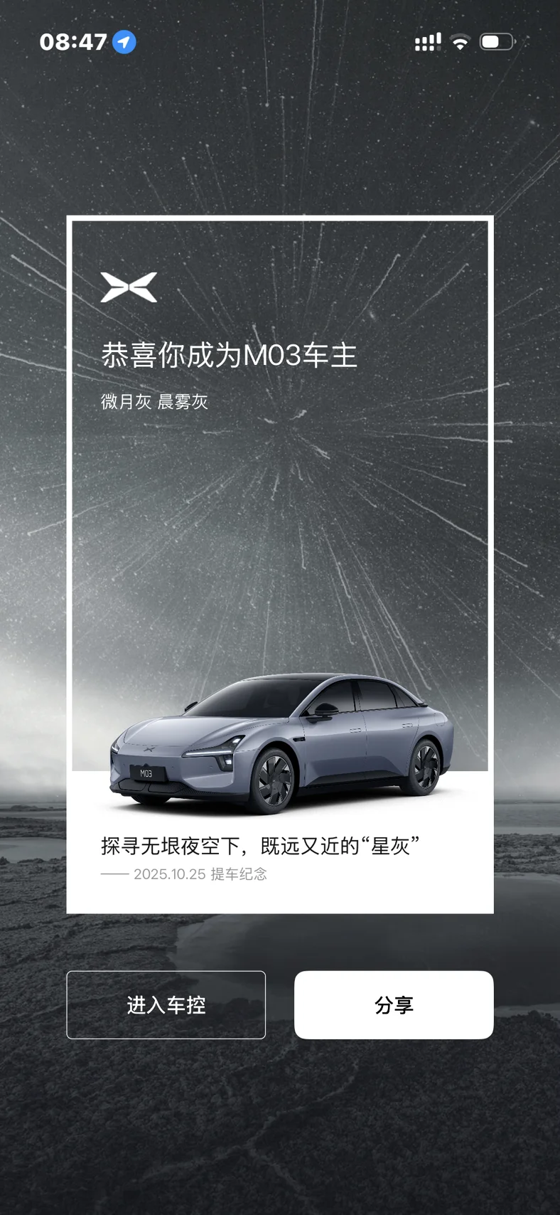 人生第一辆车终于到手啦!从24年的时候就开始慢慢关注,因为颜值选择了MONA03,颜色在紫色和微月灰之间考虑了很久,试驾看车后最终选择了微月灰,不是普通的灰色,阳光下会泛一点点蓝调,质感直接拉满,非常帅!