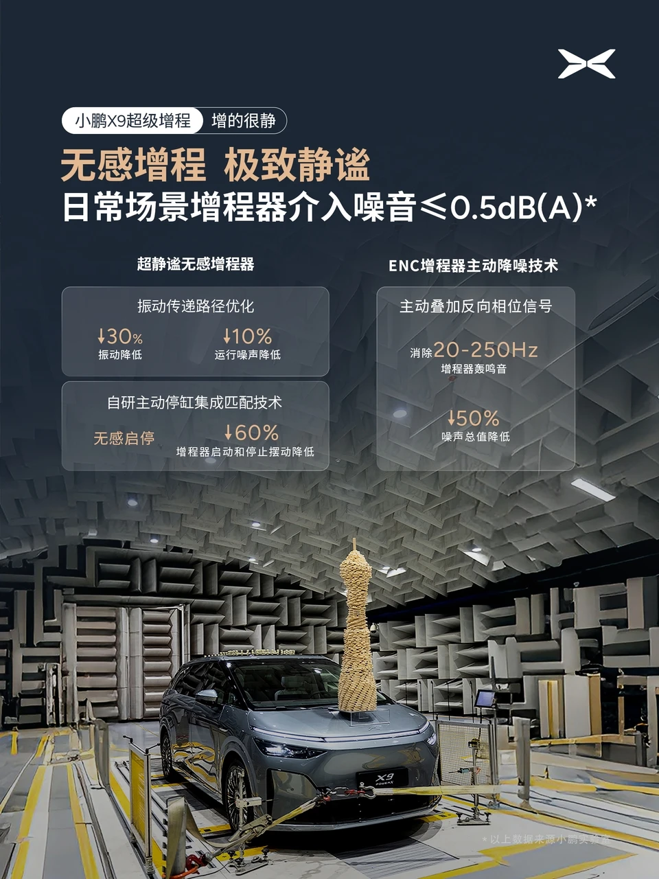 小鹏X9超级增程,「超静谧无感增程器」搭配「ENC主动降噪技术」,日常用车场景增程器介入噪音≤0.5dB(A),细微如雪花飘落地面的摩擦声。