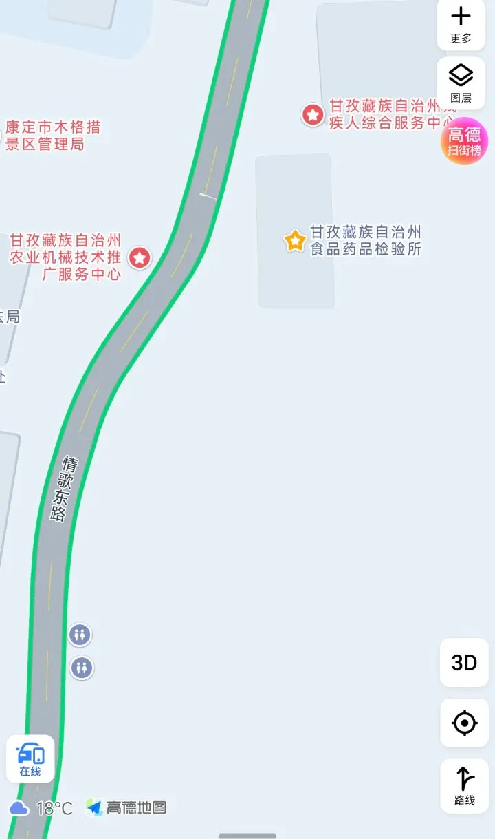吃饱喝足后就前往今天的露营点,康定市海拔2800米,适合住宿,我们进藏要在低海拔休息,让身体慢慢适应,可以有效避免高反,导航搜索“康定食品药品检验所”再往前100米就是公共厕所,有水24小时开放,道路两侧可以停车(注意:厕所这一段是非铺装路面,其实露营点就是情歌东路两侧路边)