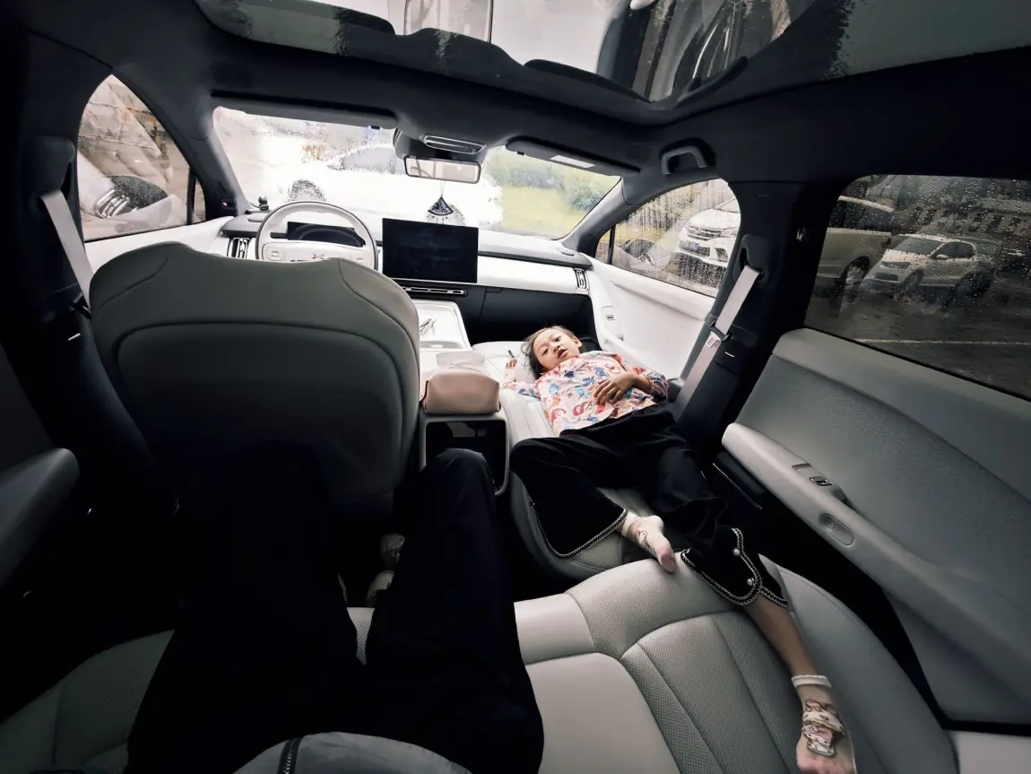 2⃣还有次带着孩子在车里等妈妈的时候,第一次尝试副驾座椅一键切换至单人床模式,孩子躺在那儿和我聊天,那一刻感到一丝小温暖。