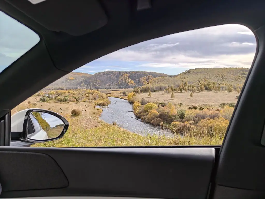 下方的图123,这个是在阿尔山市的森林深处。副驾窗外就是金黄成片的白桦林树群,还有蜿蜒的河水。绝美🤩