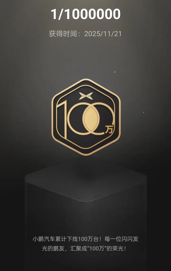也是很幸运,迎来了小鹏的100万台下线,很幸运成为这百万分之一的一员!我也是见证了小鹏的低谷与现在的兴盛!觉得小鹏真的很不容易,从很多人都唱衰它,到现在成为市场的宠儿!全系车型愤然而起,这离不开每一个小鹏人的努力!希望见证未来下一个100万!1000万!!