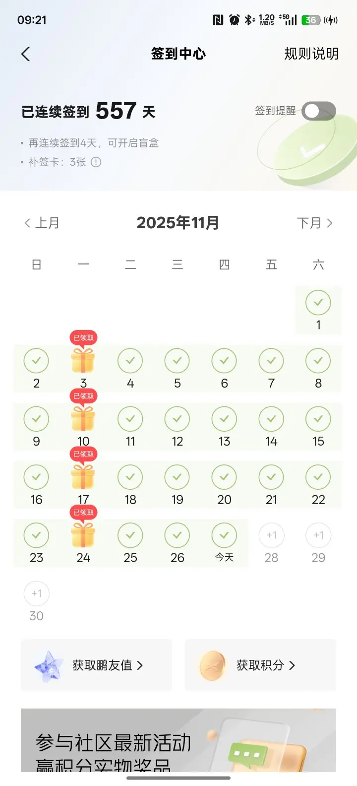 之后,我更加深入的了解了“鹏友”的文化,开始养成的签到习惯,如今已延续557天,即便签到没有积分奖励,这份对小鹏的热爱也从未消减,反而随着相处日久愈发深厚。