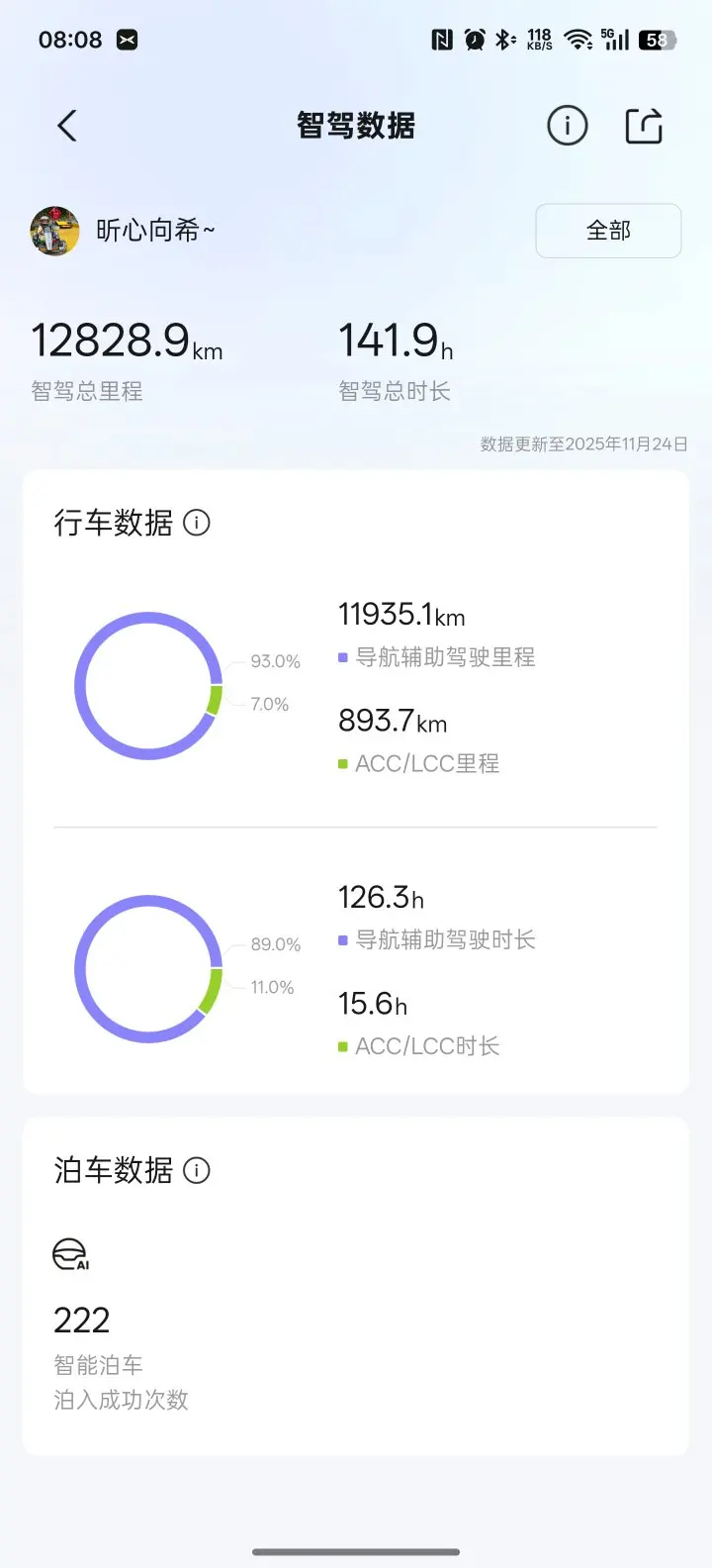 智驾方面,Pro版本虽没有端到端城区NGP,但高速NGP和LCC已能覆盖90%的长途需求。高速上它的车道选择逻辑很智能,会主动避开大货车车道,打灯变道流畅自然,跟车减速也十分平顺。印象深刻的是今年五一,暴雨夜间行驶时,毫米波雷达与视觉融合感知系统依旧稳定,连续3小时高速零接管,极大缓解了驾驶疲劳。截至目前,辅助智驾里程早已突破13000公里(ps.去年智驾数据升级,覆盖了部分数据),说是我和G6"一人开一半"毫不夸张。