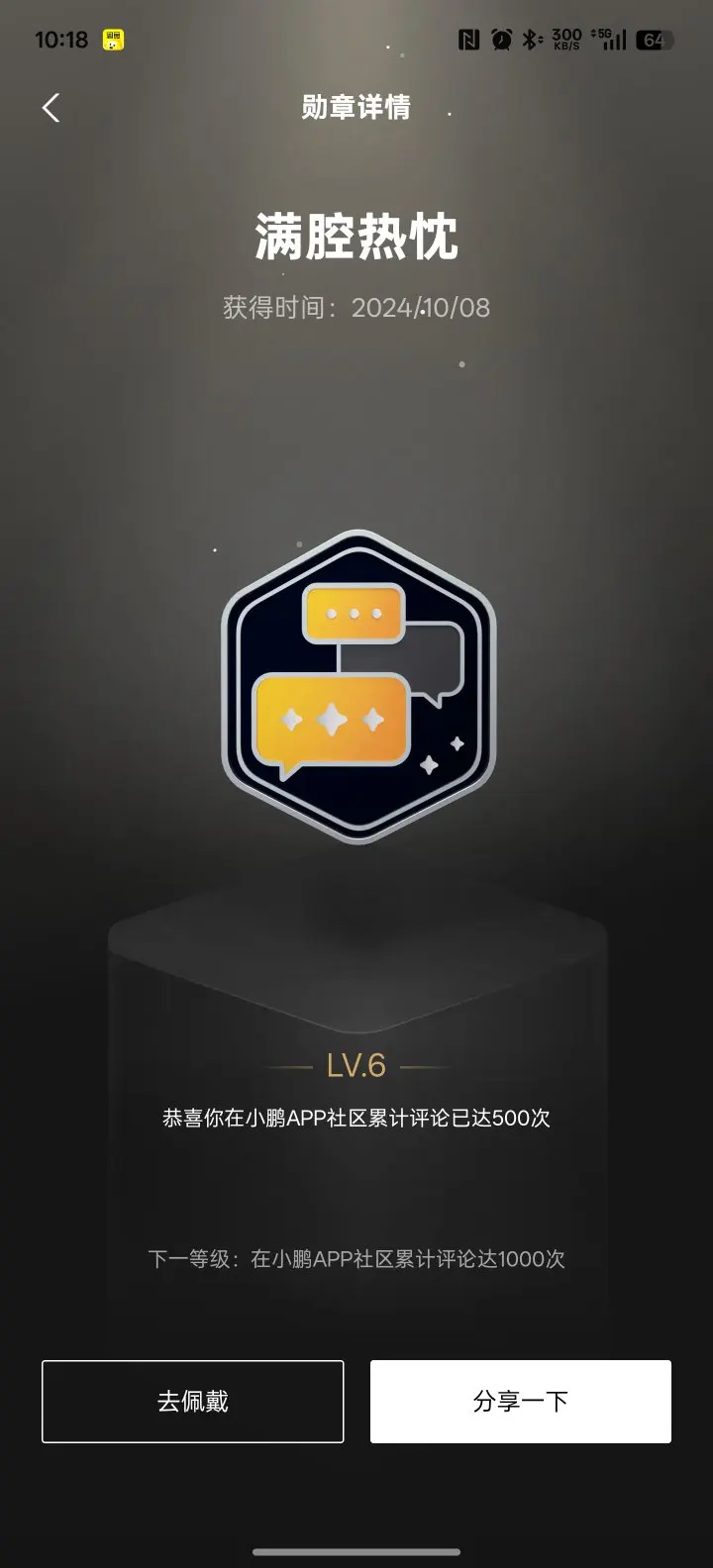 在小鹏社区,我分享了很多G6的"硬知识"和"趣生活",智慧场景被几十个鹏友认可,社区互动超500次,收获的不仅是勋章,更是志同道合的鹏友情谊。通过APP商城购买和社区活动,我还攒齐了露营全套装备,甚至装扮了专属的小鹏茶室,让这份热爱渗透到生活的方方面面。