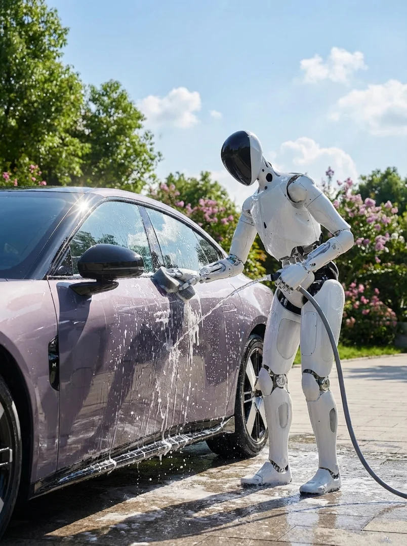 当然啦,做为一名爱干净的女车主,最喜欢的是它洗车时可爱的样子:一只手攥着海绵擦车门,另一只手把水管捏得刚好——泡沫顺着车身往下流的时候,你会恍惚觉得这就是个帮你分担家务的室友,并不是什么冷冰冰的“高科技展品”。